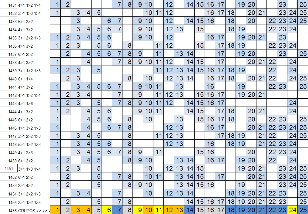 Para o concurso da lotofácil 1456 extraí os seguintes grupos